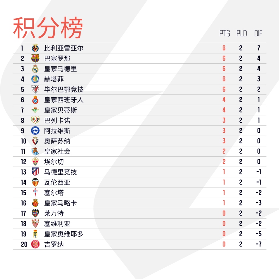 积分榜方面,比利亚雷亚尔、巴塞罗那、皇家马德里、赫塔菲、毕尔巴鄂竞技新赛季开局两连胜均取6分,分别位列积分榜前五的位置。